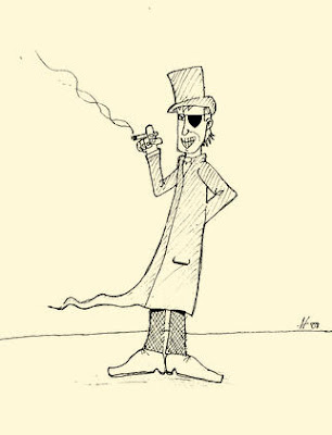 Loathsome still looked as loathsome as I remember him; he was a skinny and wiry fellow, wearing a long, dark-grey overcoat on top of a black suit, with a similarly dark top hat on his awful, greasy, straggly blonde-hair. He had a long, pointed nose, and his cruel, thin lips were contorted into some sort of wretched smile. The only change I could really observe was that he now sported an eye-patch across his left eye, leaving only one piggy eyeball free to glare at me.